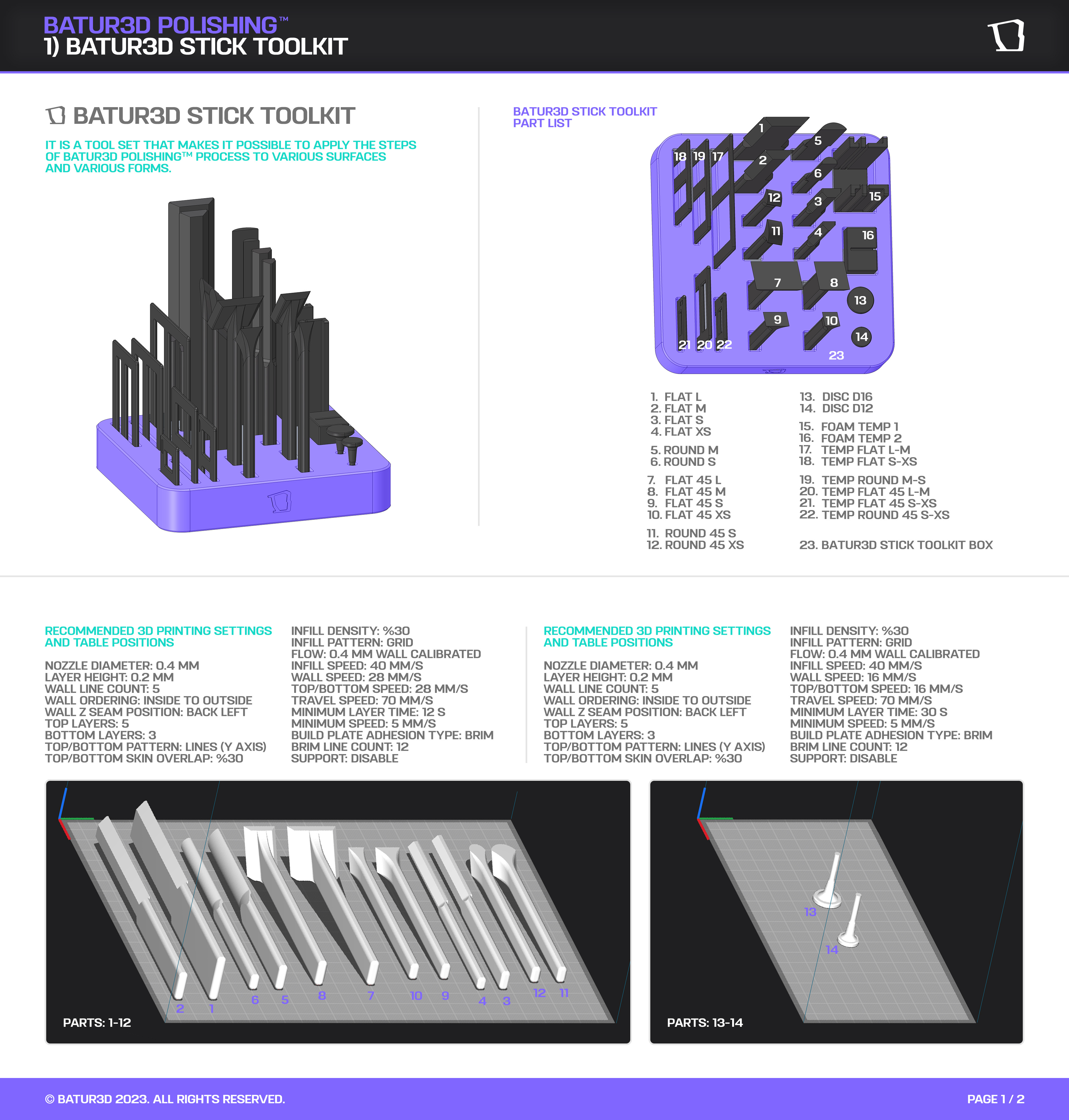Hello, welcome to BATUR3D. During the application, we work with 3D printable tools. With the tools, we perform sanding and polishing operations on the part. With the templates, we cut sandpaper and polishing foam in suitable sizes for the tools. The numbers and names of the tools in the toolkit are included. Within the system, teams are matched with these numbers and names.