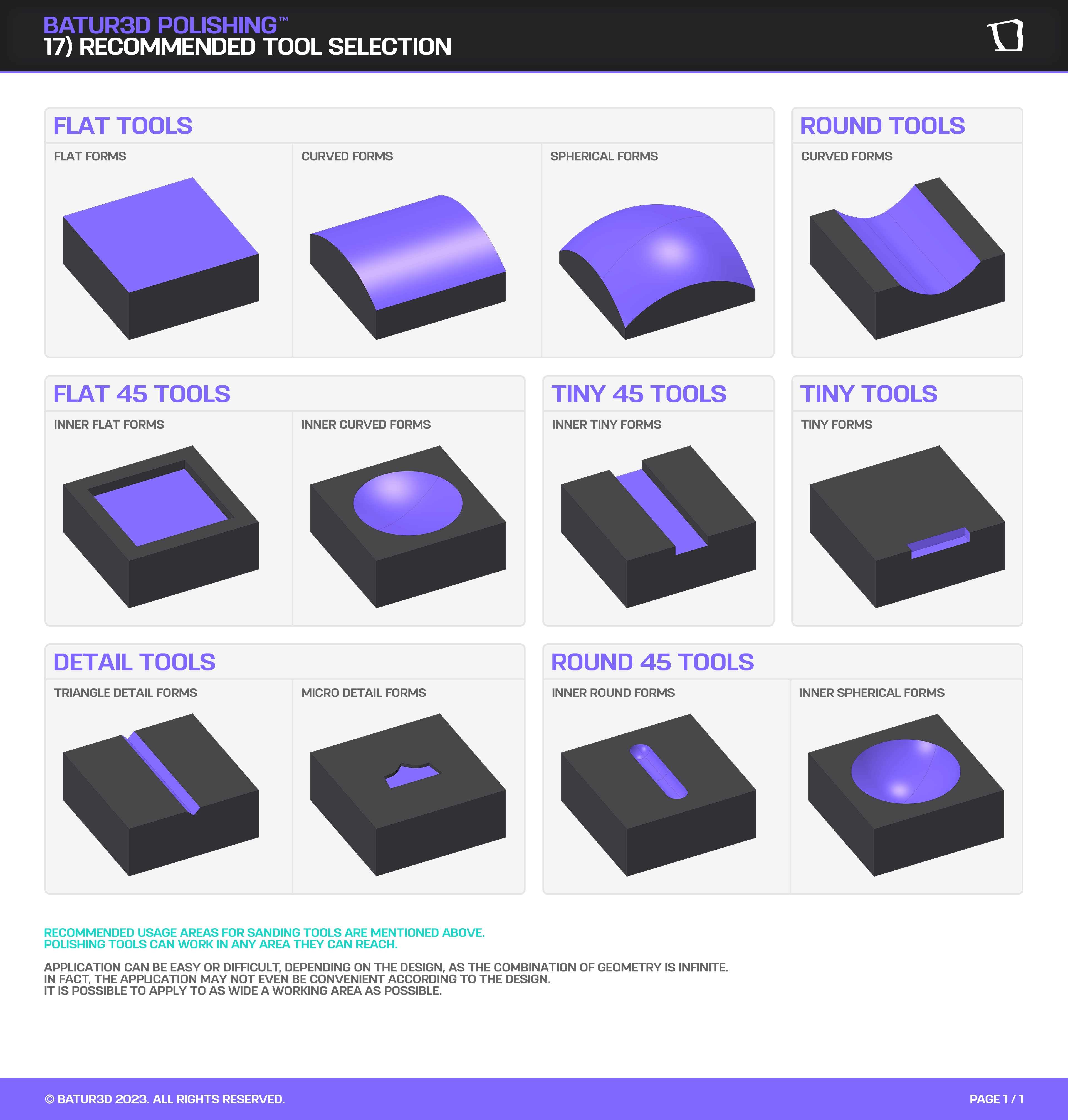 First we need to get to know the product before we start the application. By examining the part/product, we should understand what kind of geometric structure it has. Then we can easily determine which tools we can use according to the forms with this infographic. BATUR3D POLISHING™ process main elements and all details are presented to you. Thank you very much to all who are interested in the method. We have the freedom to produce a single limited edition and industrial quality production with low budget printers.