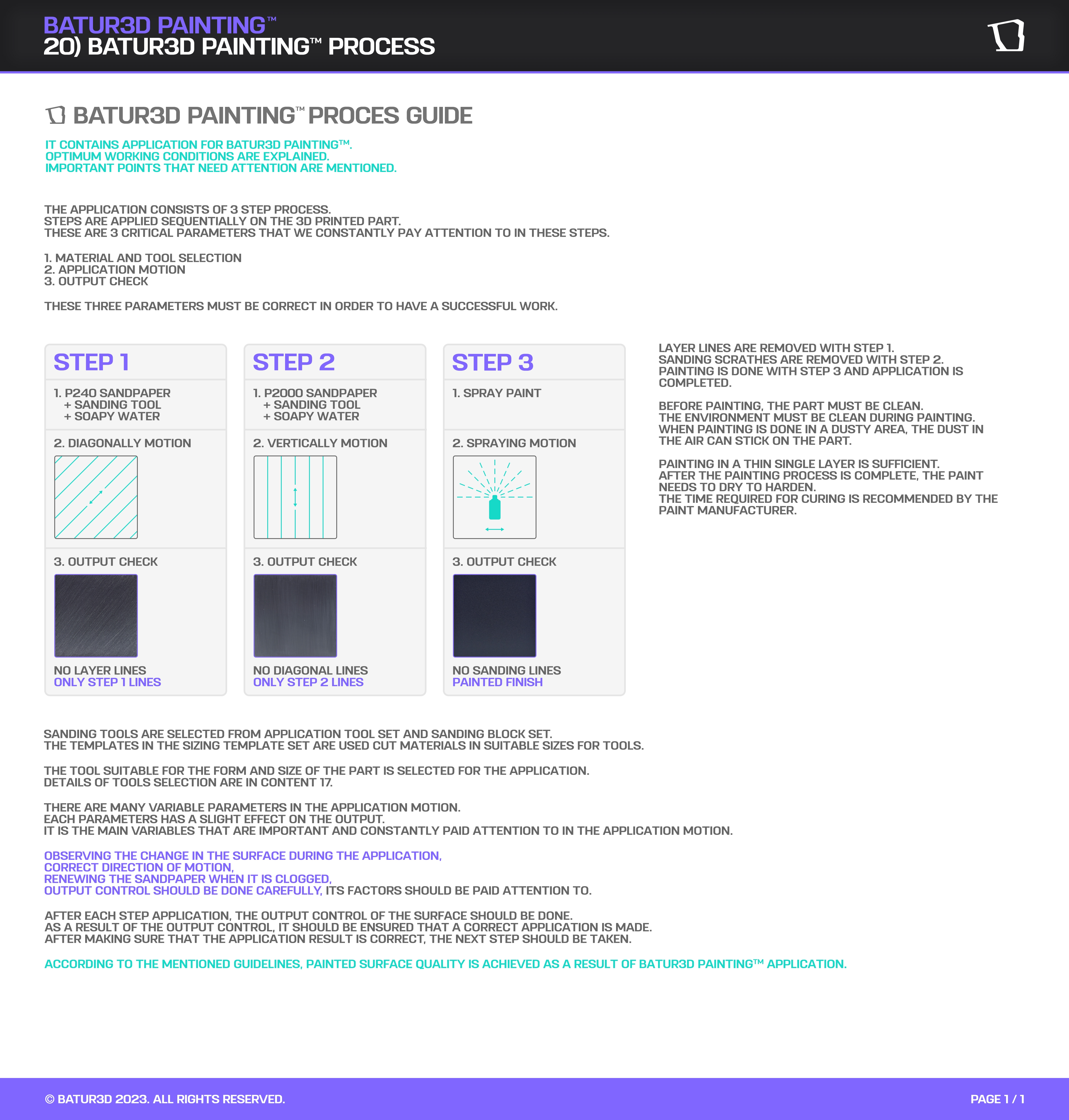 BATUR3D PAINTING™ process main elements and all details are presented to you. When applying, care should always be taken to do a correct work. For this, the specified guidelines must be followed. 3 steps are applied in a sequential manner. Working outside the instructions in any step, working sloppy, may cause an erroneous result. It is a practical procedure. Motip Carat Spray Paint is the recommended product for application. Other paint brands whose quality you are sure of can also be used in the application. Using this system, you can apply BATUR3D PAINTING™ on your products and get premium painted surface quality.